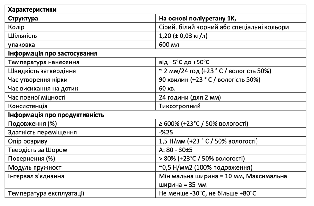 застосовується в горизонтальних та вертикальних швах, на основі поліуретану, однокомпонентний.